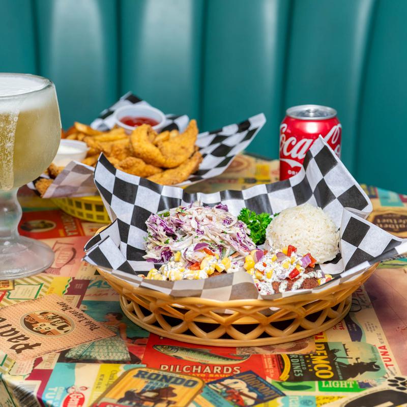 Proteins: Fried Catfish, Fried Shrimp, Alligator, Chicken Strips, Frog Legs, Gizzards, Crab Cake, Flounder | Sides: French Fries, Hush Puppies, Cajun Coleslaw, Coconut Rice, Bebe’s Potato Salad, Sweet Potato Tots $2.15, Side Salad $2.15